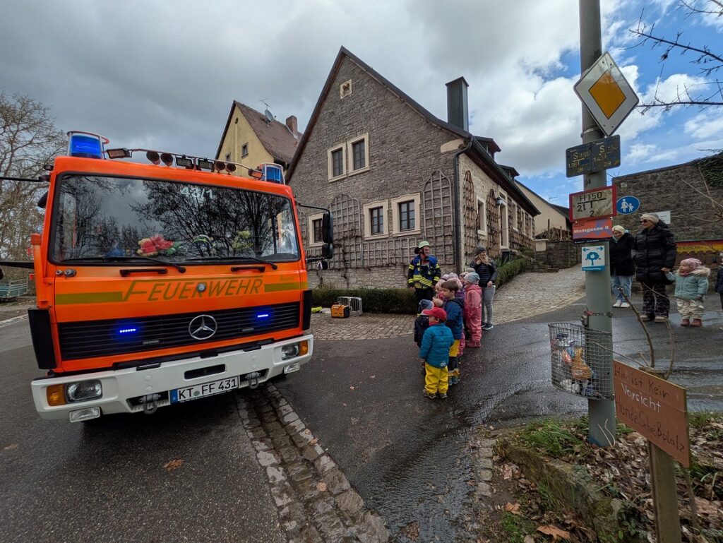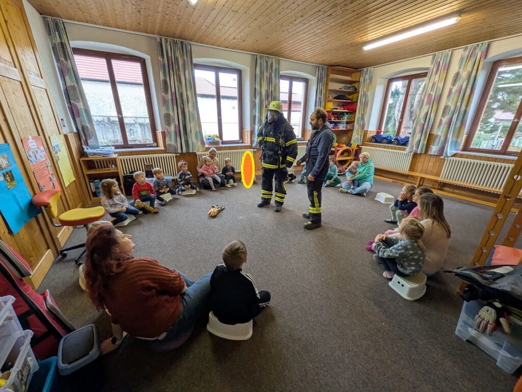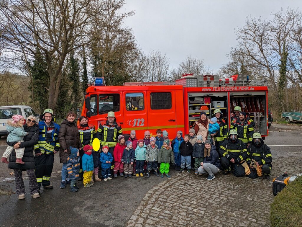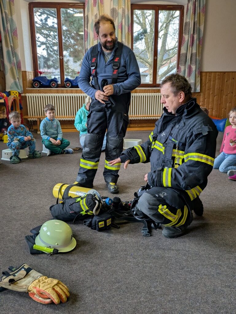 Wie freuten sich die Kinder als die Feuerwehr wieder zu uns in den Kiga kam. Im Morgenkreis zeigten 2 Feuerwehrmänner ihre Ausrüstung und erklärten den Kindern wie sie sich im Brandfall verhalten müssen. Berührungsängste gab es seitens der Kinder keine.