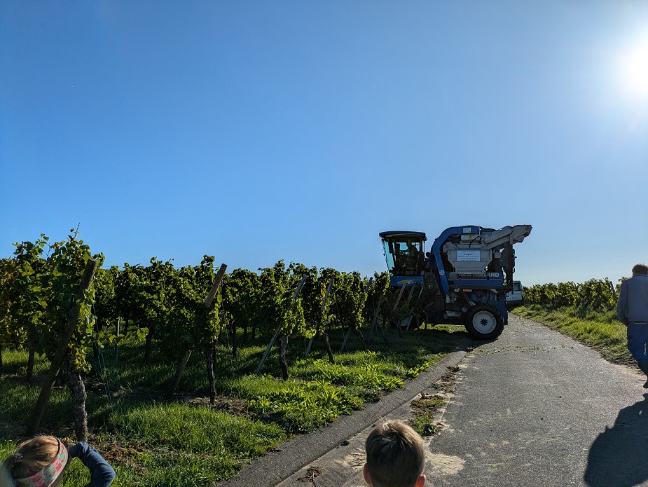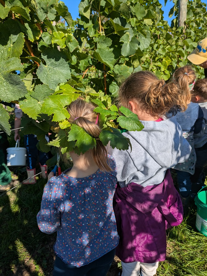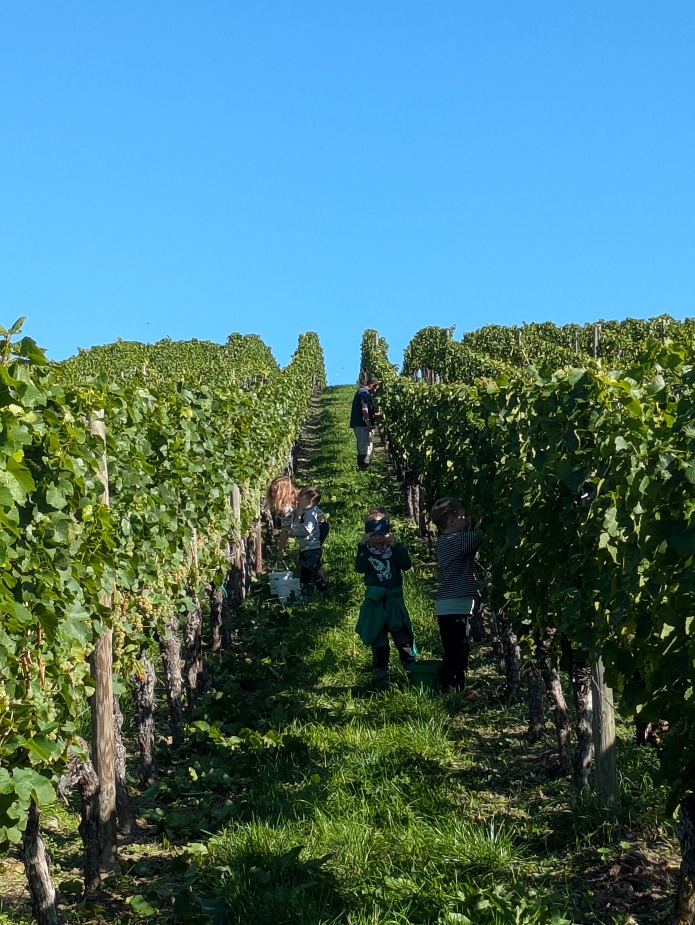Am Mittwoch, 18.09.2025 machten sich die Regenbogen- und Sonnenkinder gemeinsam auf den Weg zur Weinlese bei Familie Armin Meusert. Nach einem langen Fußmarsch kamen wir in den Weinbergen an, wo bereits der Vollernter bereitstand. Für die Kinder war es ein besonders Erlebnis, diesen aus nächster Nähe zu bestauen – sie durften sogar mit auf den Vollernter und den Traktor. Mit großer Begeisterung halfen die Kinder anschließend beim Traubenlesen. Sie schnitten fleißig die reifen Früchte von den Reben und lernten dabei viel über die Arbeit im Weinberg. Zur Stärkung gab es eine gemütliche Brotzeit zwischen den Reben. Bei strahlendem Sonnenschein schmeckten die leckeren Muffins, die uns von Stefanie Meusert gebacken wurden. Es war ein spannender und erlebnisreicher Tag, der den Kindern lange in Erinnerung bleiben wird.