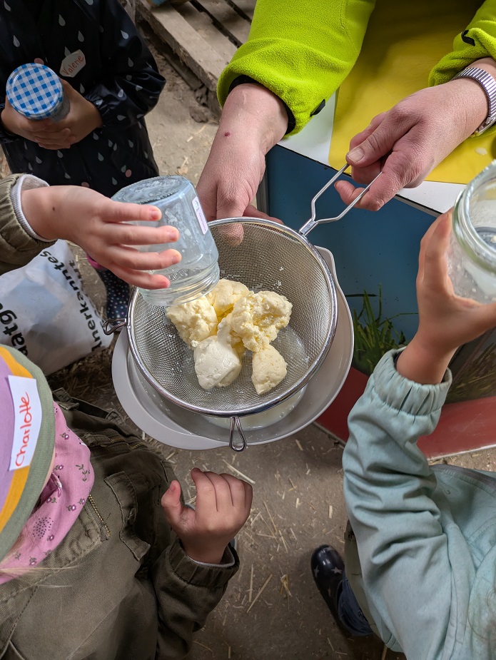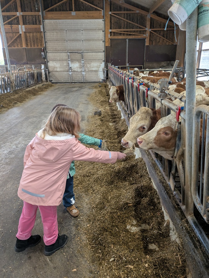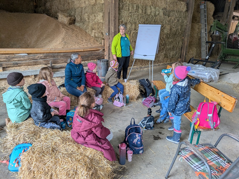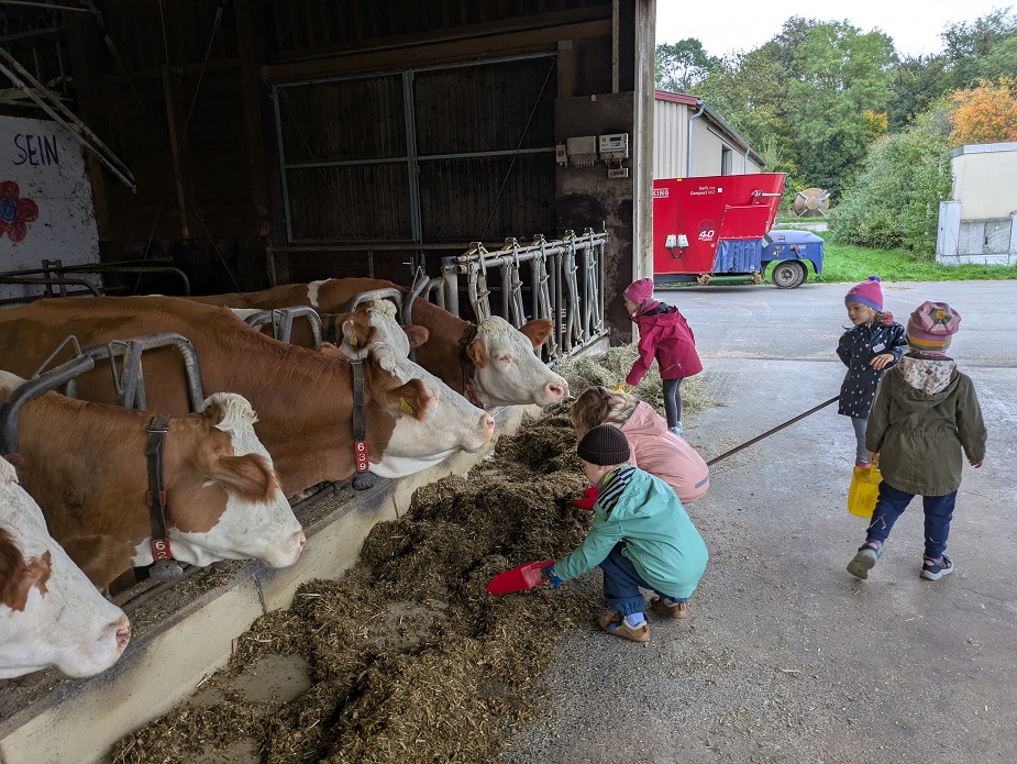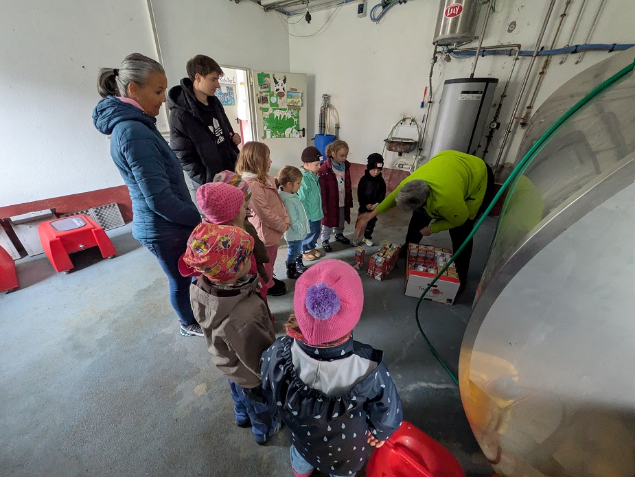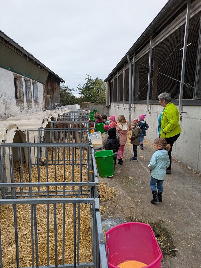 Im Rahmen unsere Bauernhofprojekts waren wir zu Besuch auf dem Rosenhof in Gerolzhofen. Besonders beeindruckt waren die Kinder von den vielen Kühen. Sie erfuhren von Bäuerin Manuela Hauck, dass eine Kuh bis zu 100 Liter Wasser am Tag trinkt und bis zu 30 Liter Milch gibt. Auch dass Kühe Milchzähne haben, war für viele neu. Ein besonderes Highlight war die Begegnung mit den Kälbchen. Ein erst 2 Tage altes noch namenloses Kälbchen wurde von den Kindern auf den Namen „Olive“ getauft. Die Kinder durften die Kälbchen streicheln und beim Füttern der Kühe helfen. Große Begeisterung löste der Melkroboter aus. Wie das Melken funktioniert, konnten sie anschließend selbst an einem Plastikeuter ausprobieren. Zum Abschluss wurde aus Sahne Butter hergestellt, die sich die Kinder auf frischem Brot schmecken ließen. Dazu gab es Milch und Buttermilch.